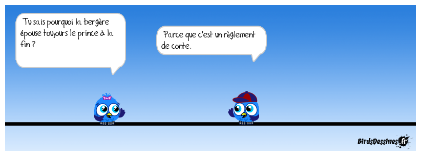 Case 1:Bird 1: Tu sais pourquoi la bergère épouse toujours le prince à la fin ? | Case 2: Bird 1: Parce que c'est un règlement de conte. | Case 3: