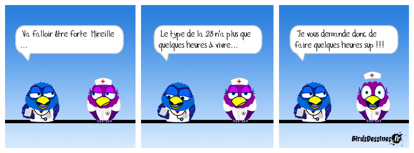 Case 1:Bird 1: Va falloir être forte Mireille ... | Case 2: Bird 1: Le type de la 28 n'a plus que quelques heures à vivre... | Case 3: Bird 1: Je vous demande donc de faire quelques heures sup !!!