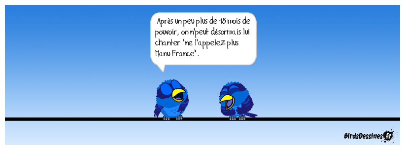Case 1: | Case 2: Bird 1: Après un peu plus de 18 mois de pouvoir, on n'peut désormais lui chanter "ne l'appelez plus Manu France". | Case 3: