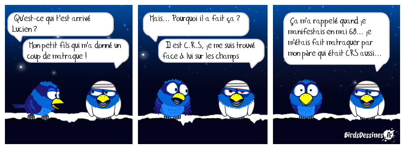Case 1:Bird 1: Qu'est-ce qui t'est arrivé Lucien ?Bird 2: Mon petit fils qui m'a donné un coup de matraque ! | Case 2: Bird 1: Mais... Pourquoi il a fait ça ? Bird 2: Il est C.R.S, je me suis trouvé face à lui sur les champs | Case 3: Bird 1: Ça m'a rappelé quand je manifestais en mai 68... je m'étais fait matraquer par mon père qui était CRS aussi...