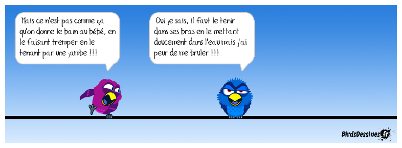 Case 1:Bird 1: Mais ce n'est pas comme ça qu'on donne le bain au bébé, en le faisant tremper en le tenant par une jambe !!! | Case 2: Bird 1: Oui je sais, il faut le tenir dans ses bras en le mettant doucement dans l'eau mais j'ai peur de me bruler !!! | Case 3: