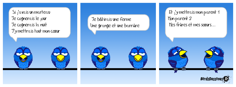Case 1:Bird 1: Si j'avais un marteau Je cognerais le jour Je cognerais la nuit J'y mettrais tout mon cœur | Case 2: Bird 1: Je bâtirais une ferme Une grange et une barrière | Case 3: Bird 1: Et j'y mettrais mon parent 1 Mon parent 2 Mes frères et mes sœurs...