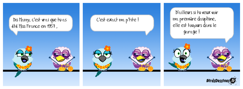Case 1:Bird 1: Dis Mamy, c'est vrai que tu as été Miss France en 1957 , | Case 2: Bird 1: C'est exact ma p'tite ! | Case 3: Bird 1: D'ailleurs si tu veux voir ma première dauphine, elle est toujours dans le garage !