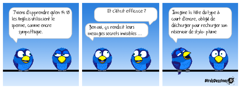 Case 1:Bird 1: J'viens d'apprendre qu'en 14 18 les Anglais utilisaient le sperme, comme encre sympathique. | Case 2: Bird 1: Et c'était efficace ? Bird 2: Ben oui, ça rendait leurs messages secrets invisibles ... | Case 3: Bird 1: Imagine la tête du type à court d'encre, obligé de décharger pour recharger son réservoir de stylo- plume