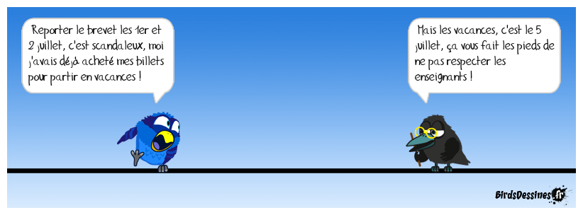 Case 1:Bird 1: Reporter le brevet les 1er et 2 juillet, c'est scandaleux, moi j'avais déjà acheté mes billets pour partir en vacances ! | Case 2: | Case 3: Bird 1: Mais les vacances, c'est le 5 juillet, ça vous fait les pieds de ne pas respecter les enseignants !