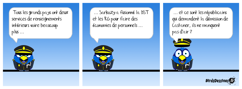 Case 1:Bird 1: Tous les grands pays ont deux services de renseignements intérieurs voire beaucoup plus ... | Case 2: Bird 1: ... Sarkozy a fusionné la DST et les RG pour faire des économies de personnels ... | Case 3: Bird 1: ... et ce sont les républicains qui demandent la démission de Castaner, ils ne manquent pas d'air ?