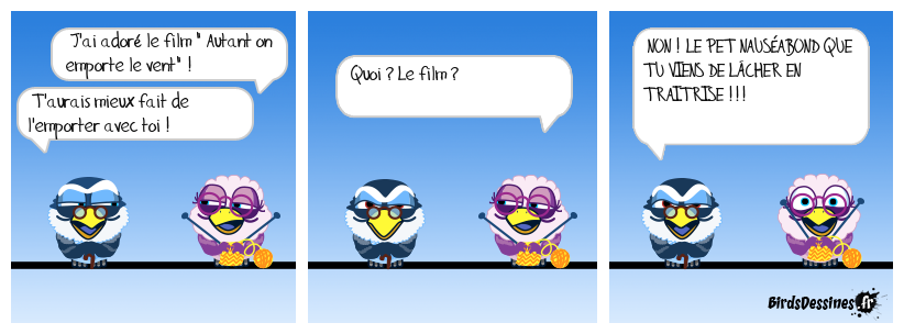 Case 1:Bird 1: J'ai adoré le film " Autant on emporte le vent" !Bird 2: T'aurais mieux fait de l'emporter avec toi ! | Case 2: Bird 1: Quoi ? Le film ? | Case 3: Bird 1: NON ! LE PET NAUSÈABOND QUE TU VIENS DE LÄCHER EN TRAITRISE !!!