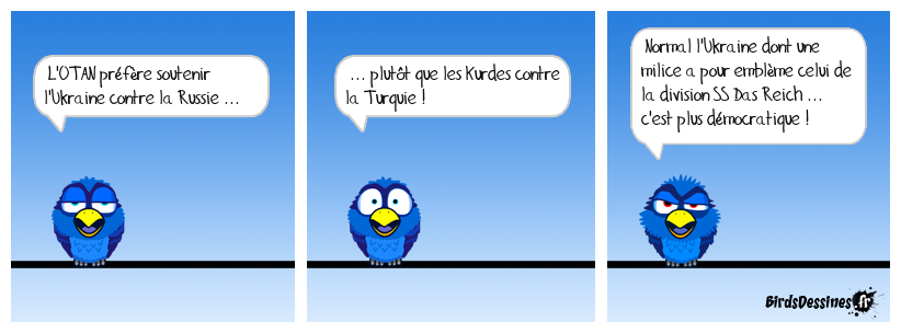 Case 1:Bird 1: L'OTAN préfère soutenir l'Ukraine contre la Russie ... | Case 2: Bird 1: ... plutôt que les Kurdes contre la Turquie ! | Case 3: Bird 1: Normal l'Ukraine dont une milice a pour emblème celui de la division SS Das Reich ... c'est plus démocratique !
