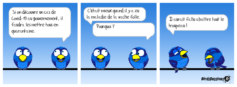 Case 1:Bird 1: Si on découvre un cas de Covid-19 au gouvernement, il faudra les mettre tous en quarantaine. | Case 2: Bird 1: C'était mieux quand il y a eu la maladie de la vache folle. Bird 2: Pourquoi ? | Case 3: Bird 1: Il aurait fallu abattre tout le troupeau !
