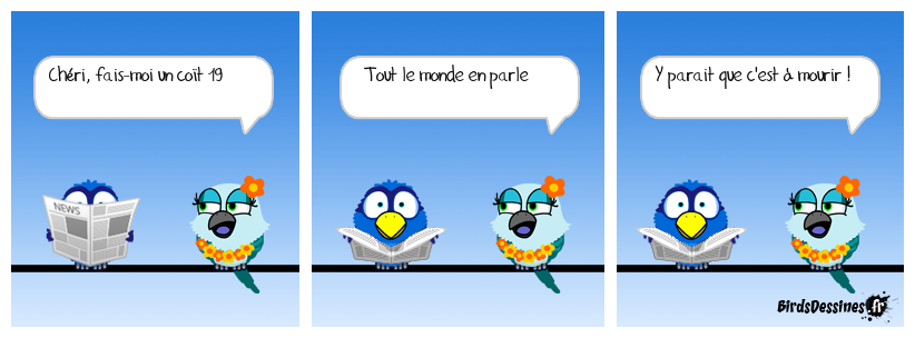 Case 1:Bird 1: Chéri, fais-moi un coît 19 | Case 2: Bird 1: Tout le monde en parle | Case 3: Bird 1: Y parait que c'est à mourir !