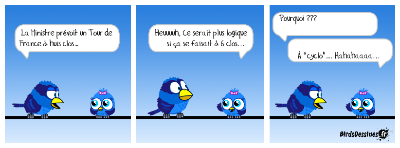 Case 1:Bird 1: La Ministre prévoit un Tour de France à huis clos… | Case 2: Bird 1: Heuuuuh, Ce serait plus logique si ça se faisait à 6 clos... | Case 3: Bird 1: Pourquoi ??? Bird 2: À “cyclo"…. Hahahaaaa...