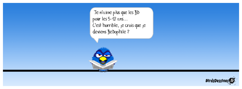 Case 1:Bird 1: Un homme qui n'avait pas manger depuis 3 jours, a braqué un épicier avec une hache.... | Case 2: Bird 1: Je n'aime plus que les BD pour les 5-12 ans... C'est horrible, je crois que je deviens BeDophile ? | Case 3: Bird 1: La faim justifie les moyens