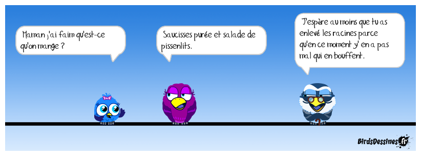 Case 1:Bird 1: Maman j'ai faim qu'est-ce qu'on mange ? | Case 2: Bird 1: Saucisses purée et salade de pissenlits. | Case 3: Bird 1: J'espère au moins que tu as enlevé les racines parce qu'en ce moment y' en a pas mal qui en bouffent.
