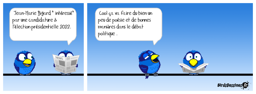 Case 1:Bird 1: Jean-Marie Bigard " intéressé" par une candidature à l'élection présidentielle 2022. | Case 2: Bird 1: Cool ça va faire du bien un peu de poésie et de bonnes manières dans le débat politique . | Case 3: