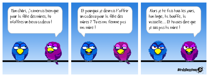 Case 1:Bird 1: Mon chéri, j’aimerais bien que pour la fête des mères, tu m'offres un beau cadeau ! | Case 2: Bird 1: Et pourquoi je devrais t’offrir un cadeau pour la fête des mères ? Tu es ma femme pas ma mère ! | Case 3: Bird 1: Alors je te fais tous les jours, ton linge, ta bouffe, la vaisselle... Et tu oses dire que je suis pas ta mère !