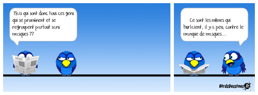 Case 1:Bird 1: Mais qui sont donc tous ces gens qui se promènent et se regroupent partout sans masques ?? | Case 2: | Case 3: Bird 1: Ce sont les mêmes qui hurlaient, il y a peu, contre le manque de masques...