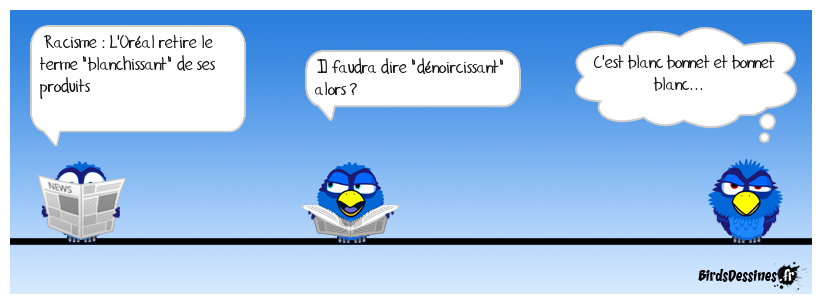 Case 1:Bird 1: Racisme : L'Oréal retire le terme "blanchissant" de ses produits | Case 2: Bird 1: Il faudra dire "dénoircissant" alors ? | Case 3: Bird 1: C'est blanc bonnet et bonnet blanc...