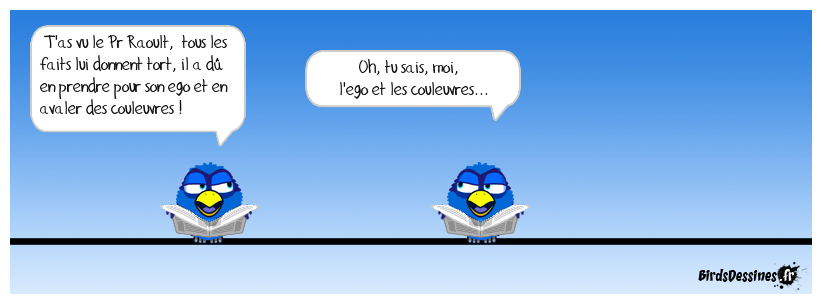 Case 1:Bird 1: T'as vu le Pr Raoult, tous les faits lui donnent tort, il a dû en prendre pour son ego et en avaler des couleuvres ! | Case 2: Bird 1: Oh, tu sais, moi, l'ego et les couleuvres... | Case 3: