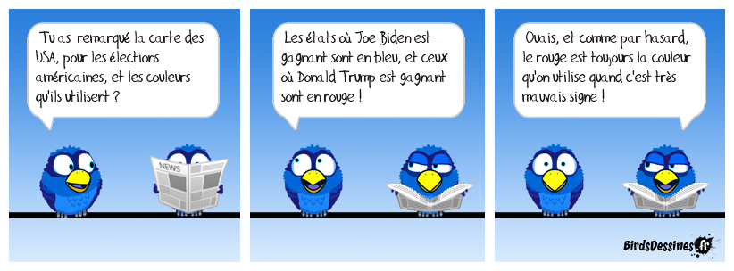 Case 1:Bird 1: Tu as remarqué la carte des USA, pour les élections américaines, et les couleurs qu'ils utilisent ? | Case 2: Bird 1: Les états où Joe Biden est gagnant sont en bleu, et ceux où Donald Trump est gagnant sont en rouge ! | Case 3: Bird 1: Ouais, et comme par hasard, le rouge est toujours la couleur qu'on utilise quand c'est très mauvais signe !