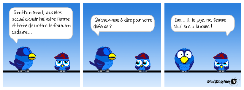 Case 1:Bird 1: Jonathan Daval, vous êtes accusé d'avoir tué votre femme et tenté de mettre le feu à son cadavre... | Case 2: Bird 1: Qu'avez-vous à dire pour votre défense ? | Case 3: Bird 1: Euh... M. le juge, ma femme était une allumeuse !