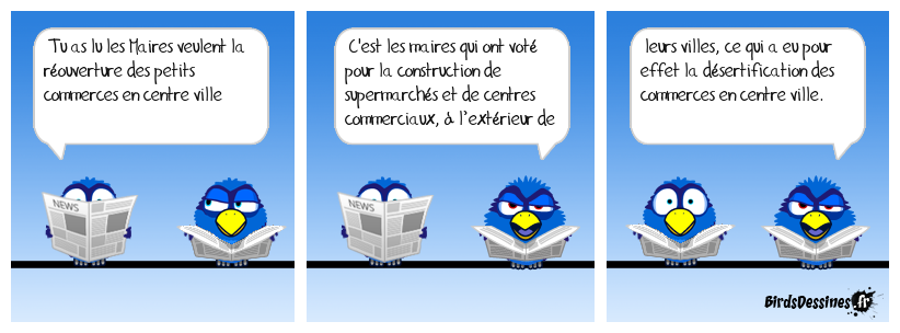 Case 1:Bird 1: Tu as lu les Maires veulent la réouverture des petits commerces en centre ville | Case 2: Bird 1: C'est les maires qui ont voté pour la construction de supermarchés et de centres commerciaux, à l’extérieur de | Case 3: Bird 1: leurs villes, ce qui a eu pour effet la désertification des commerces en centre ville.