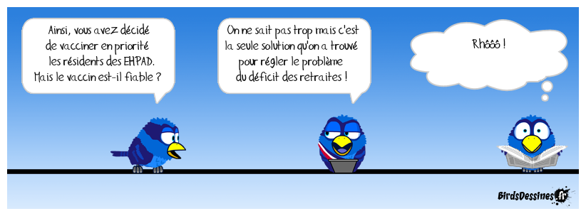 Case 1:Bird 1: Ainsi, vous avez décidé de vacciner en priorité les résidents des EHPAD. Mais le vaccin est-il fiable ? | Case 2: Bird 1: On ne sait pas trop mais c'est la seule solution qu'on a trouvé pour régler le problème du déficit des retraites ! | Case 3: Bird 1: Rhôôô !