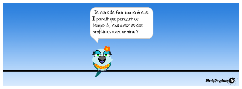 Case 1: | Case 2: Bird 1: Je viens de finir mon créneau. Il parait que pendant ce temps-là, vous avez eu des problèmes avec un virus ? | Case 3:
