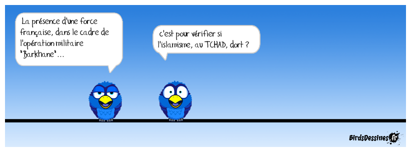 Case 1:Bird 1: La présence d'une force française, dans le cadre de l'opération militaire "Barkhane"... | Case 2: Bird 1: c'est pour vérifier si l'islamisme, au TCHAD, dort ? | Case 3: