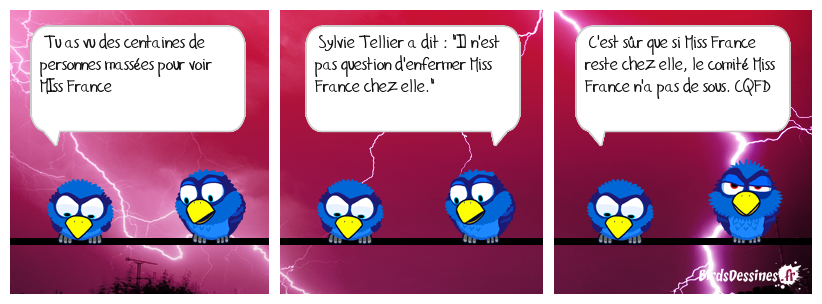 Case 1:Bird 1: Tu as vu des centaines de personnes massées pour voir MIss France | Case 2: Bird 1: Sylvie Tellier a dit : "Il n'est pas question d'enfermer Miss France chez elle." | Case 3: Bird 1: C'est sûr que si Miss France reste chez elle, le comité Miss France n'a pas de sous. CQFD