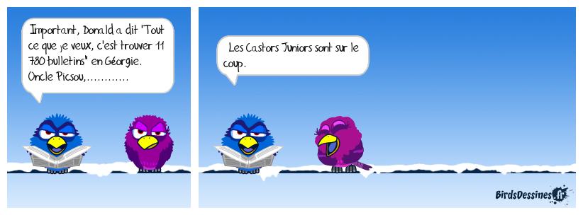 Case 1:Bird 1: Important, Donald a dit 'Tout ce que je veux, c'est trouver 11 780 bulletins" en Géorgie. Oncle Picsou,............ | Case 2: Bird 1: Les Castors Juniors sont sur le coup. | Case 3: