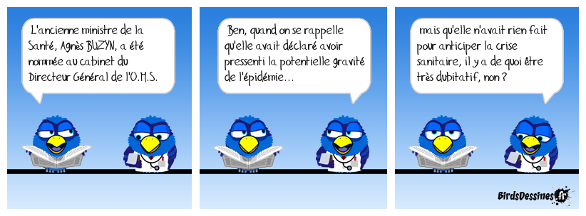 Case 1:Bird 1: L'ancienne ministre de la Santé, Agnès BUZYN, a été nommée au cabinet du Directeur Général de l'O.M.S. | Case 2: Bird 1: Ben, quand on se rappelle qu'elle avait déclaré avoir pressenti la potentielle gravité de l'épidémie... | Case 3: Bird 1: mais qu'elle n'avait rien fait pour anticiper la crise sanitaire, il y a de quoi être très dubitatif, non ?