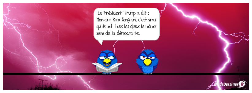 Case 1: | Case 2: Bird 1: Le Président Trump a dit : Mon ami Kim Jong-un, c'est vrai qu'ils ont tous les deux le même sens de la démocratie. | Case 3: