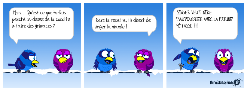 Case 1:Bird 1: Mais... Qu'est-ce que tu fais penché au dessus de la cocotte à faire des grimaces ? | Case 2: Bird 1: Dans la recette, ils disent de singer la viande ! | Case 3: Bird 1: SINGER VEUT DIRE "SAUPOUDRER AVEC LA FARINE" PÉTASSE !!!