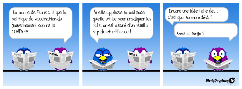 Case 1:Bird 1: La maire de Paris critique la politique de vaccination du gouvernement contre le COVID-19. | Case 2: Bird 1: Si elle applique sa méthode qu'elle utilise pour éradiquer les rats, on est assuré d'un résultat rapide et efficace ! | Case 3: Bird 1: Encore une idée folle de... c'est quoi son nom déjà ? Bird 2: Anne la Dingo ?