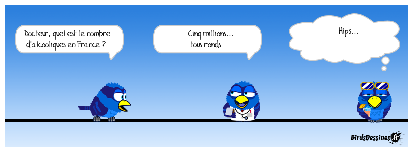 Case 1:Bird 1: Docteur, quel est le nombre d'alcooliques en France ? | Case 2: Bird 1: Cinq millions... tous ronds | Case 3: Bird 1: Hips...