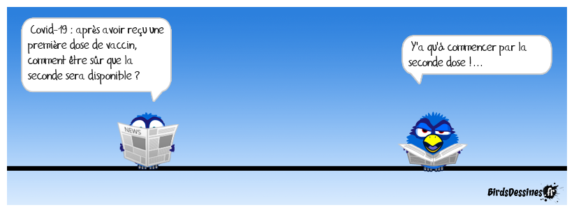 Case 1:Bird 1: Covid-19 : après avoir reçu une première dose de vaccin, comment être sûr que la seconde sera disponible ? | Case 2: | Case 3: Bird 1: Y'a qu'à commencer par la seconde dose !...