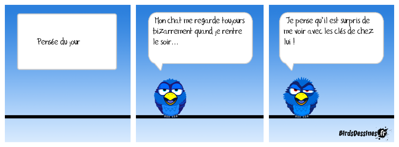 Case 1:Bird 1: Pensée du jour | Case 2: Bird 1: Mon chat me regarde toujours bizarrement quand je rentre le soir... | Case 3: Bird 1: Je pense qu’il est surpris de me voir avec les clés de chez lui !