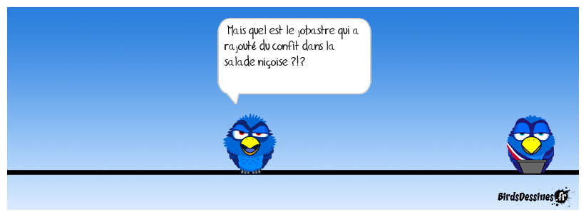 Case 1: | Case 2: Bird 1: Mais quel est le jobastre qui a rajouté du confit dans la salade niçoise ?!? | Case 3: