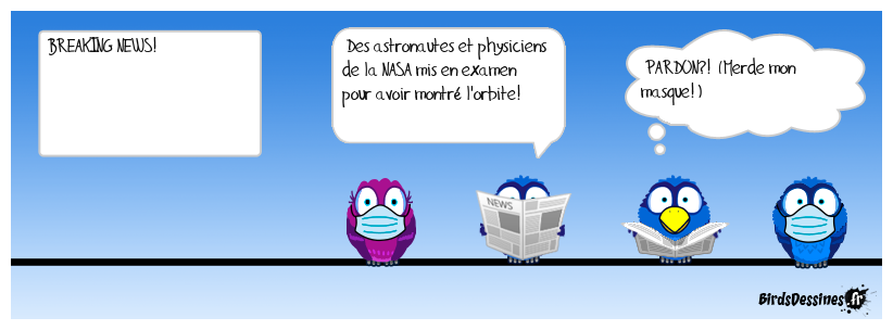 Case 1:Bird 1: BREAKING NEWS! | Case 2: Bird 1: Des astronautes et physiciens de la NASA mis en examen pour avoir montré l'orbite! | Case 3: Bird 1: PARDON?! (Merde mon masque!)