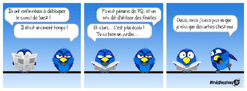 Case 1:Bird 1: Ils ont enfin réussi à débloquer le canal de Suez !Bird 2: Il était vraiment temps ! | Case 2: Bird 1: Y'avait pénurie de PQ, et on m'a dit d'utiliser des feuilles Bird 2: Et alors... C'est plus écolo ! Tu as bien un jardin... | Case 3: Bird 1: Ouais, mais j'avais pas vu que je n'ai que des orties chez moi