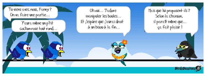 Case 1:Bird 1: Tu viens avec nous, Fanny ? On va faire une partie...Bird 2: Y'aura même un p'tit cochon rose tout rond... | Case 2: Bird 1: Oh oui... J'adore manipuler les boules... Et j'espère que j'aurai droit à un bisou à la fin... | Case 3: Bird 1: Mais que lui proposent-ils ? Selon la chanson, il paraït même que... ça fait plaisir !
