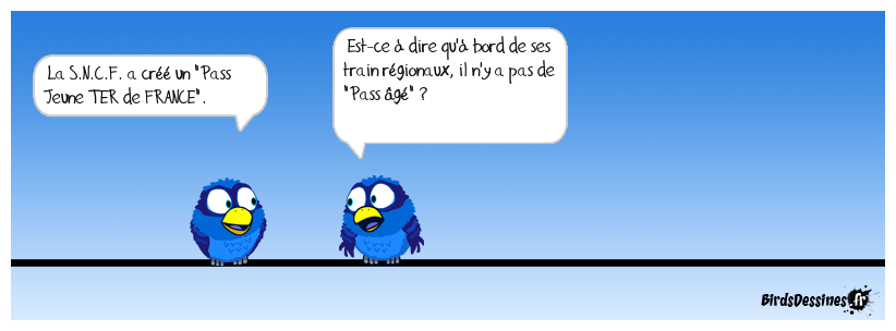 Case 1:Bird 1: La S.N.C.F. a créé un "Pass Jeune TER de FRANCE". | Case 2: Bird 1: Est-ce à dire qu'à bord de ses train régionaux, il n'y a pas de "Pass âgé" ? | Case 3: