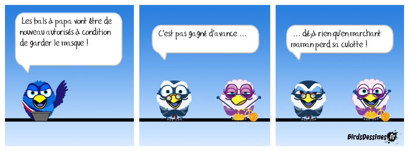 Case 1:Bird 1: Les bals à papa vont être de nouveau autorisés à condition de garder le masque ! | Case 2: Bird 1: C'est pas gagné d'avance ... | Case 3: Bird 1: ... déjà rien qu'en marchant maman perd sa culotte !