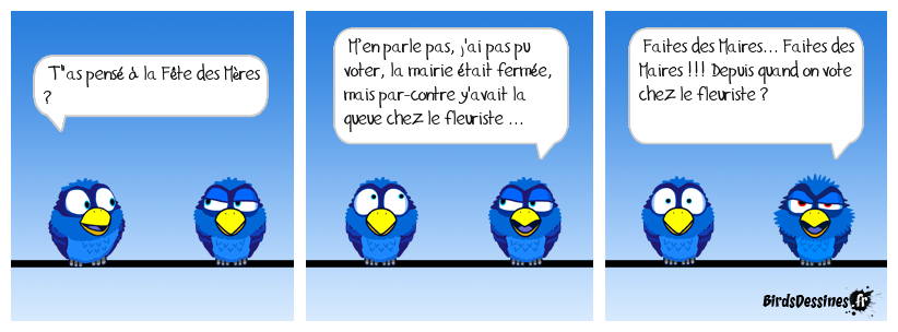 Case 1:Bird 1: T"as pensé à la Fête des Mères ? | Case 2: Bird 1: M’en parle pas, j'ai pas pu voter, la mairie était fermée, mais par-contre y'avait la queue chez le fleuriste ... | Case 3: Bird 1: Faites des Maires... Faites des Maires !!! Depuis quand on vote chez le fleuriste ?