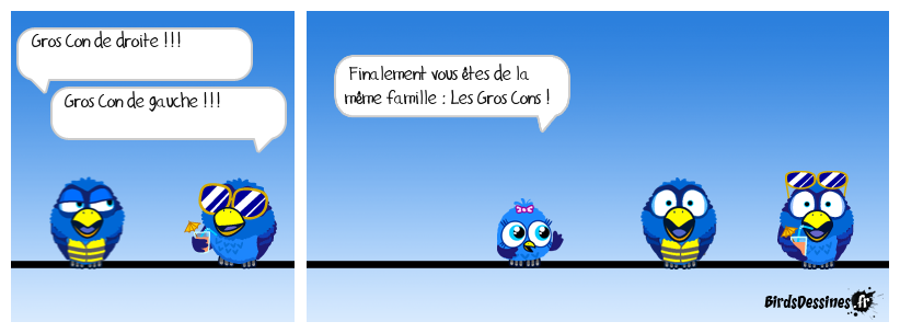 Case 1:Bird 1: Gros Con de droite !!!Bird 2: Gros Con de gauche !!! | Case 2: Bird 1: Finalement vous êtes de la même famille : Les Gros Cons ! | Case 3:
