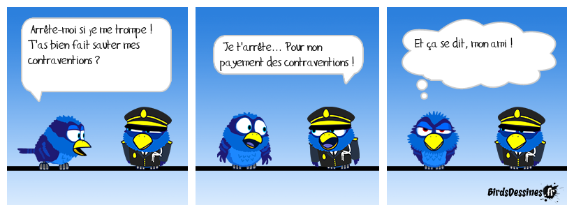 Case 1:Bird 1: Arrête-moi si je me trompe ! T'as bien fait sauter mes contraventions ? | Case 2: Bird 1: Je t'arrête... Pour non payement des contraventions ! | Case 3: Bird 1: Et ça se dit, mon ami !