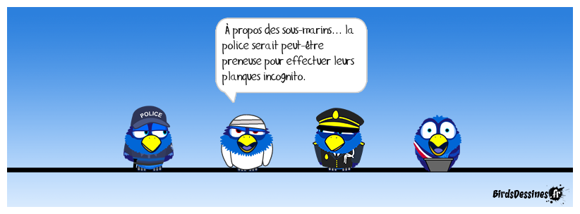 Case 1: | Case 2: Bird 1: À propos des sous-marins... la police serait peut-être preneuse pour effectuer leurs planques incognito. | Case 3:
