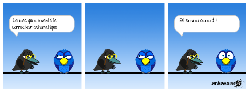 Case 1:Bird 1: Le mec qui a inventé le correcteur automatique | Case 2: | Case 3: Bird 1: Est un vrai canard !