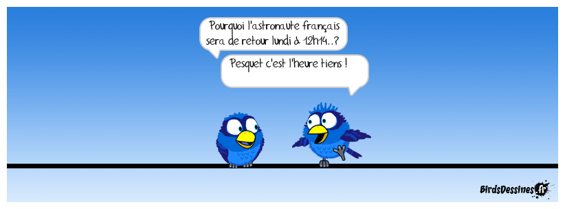 Case 1: | Case 2: Bird 1: Pourquoi l'astronaute français sera de retour lundi à 12h14..? Bird 2: Pesquet c'est l'heure tiens ! | Case 3: