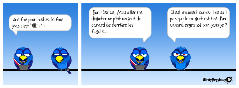 Case 1:Bird 1: Une fois pour toutes, le foie gras c'est "NIET" ! | Case 2: Bird 1: Bon ! Sur ce, j'vais aller me déguster un p'tit magret de canard de derrière les fagots... | Case 3: Bird 1: Il est vraiment con ou il ne sait pas que le magret est tiré d'un canard engraissé par gavage ?